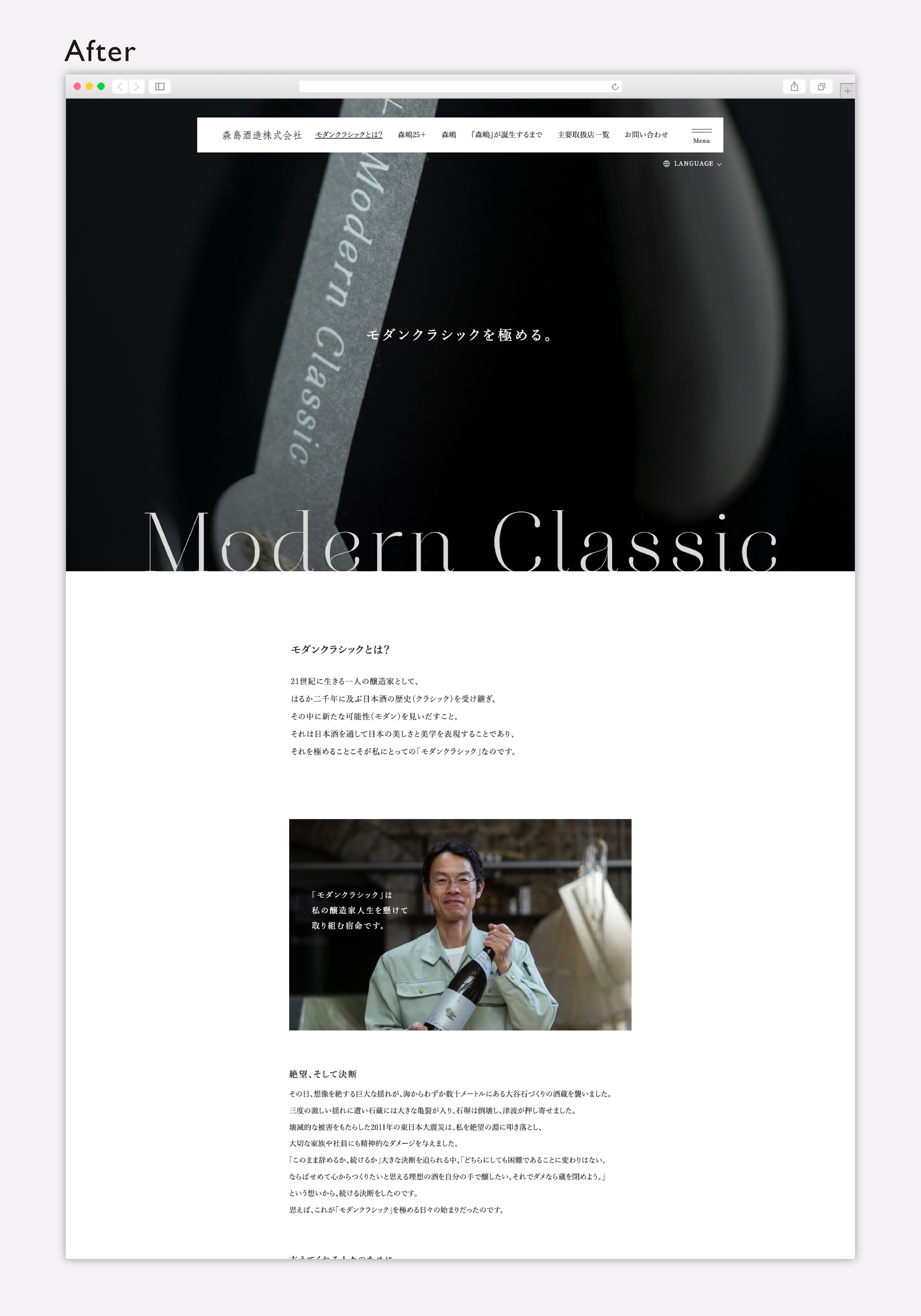 ちょうど蔵元杜氏である森嶋専務がご自身の酒造りを始めて25年の節目ということで、新商品発売と同じタイミングで、杜氏森嶋さんがつくる「森嶋シリーズ」すべての味わいを「MODERN CLASSIC」とカテゴライズ。酒の新しいジャンルとして日本酒の世界に「MODERN CLASSIC」のフラグを立て、その味わいに共感してくださるファンの方たちとのコミュニティーを形成するというストーリーを発案。